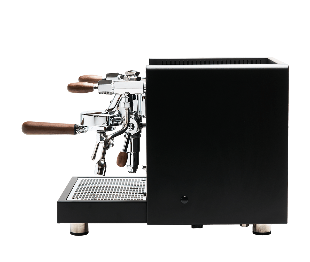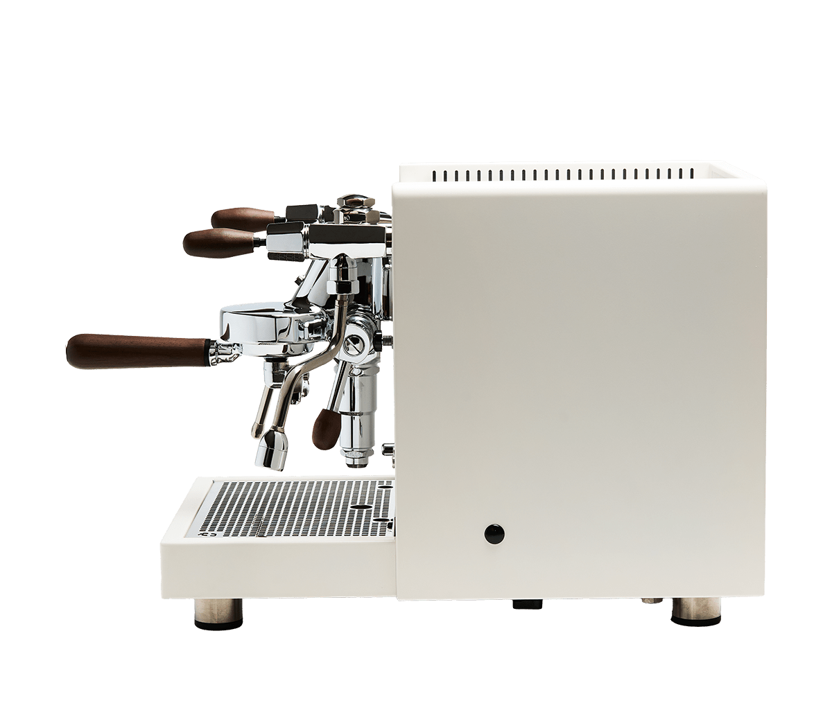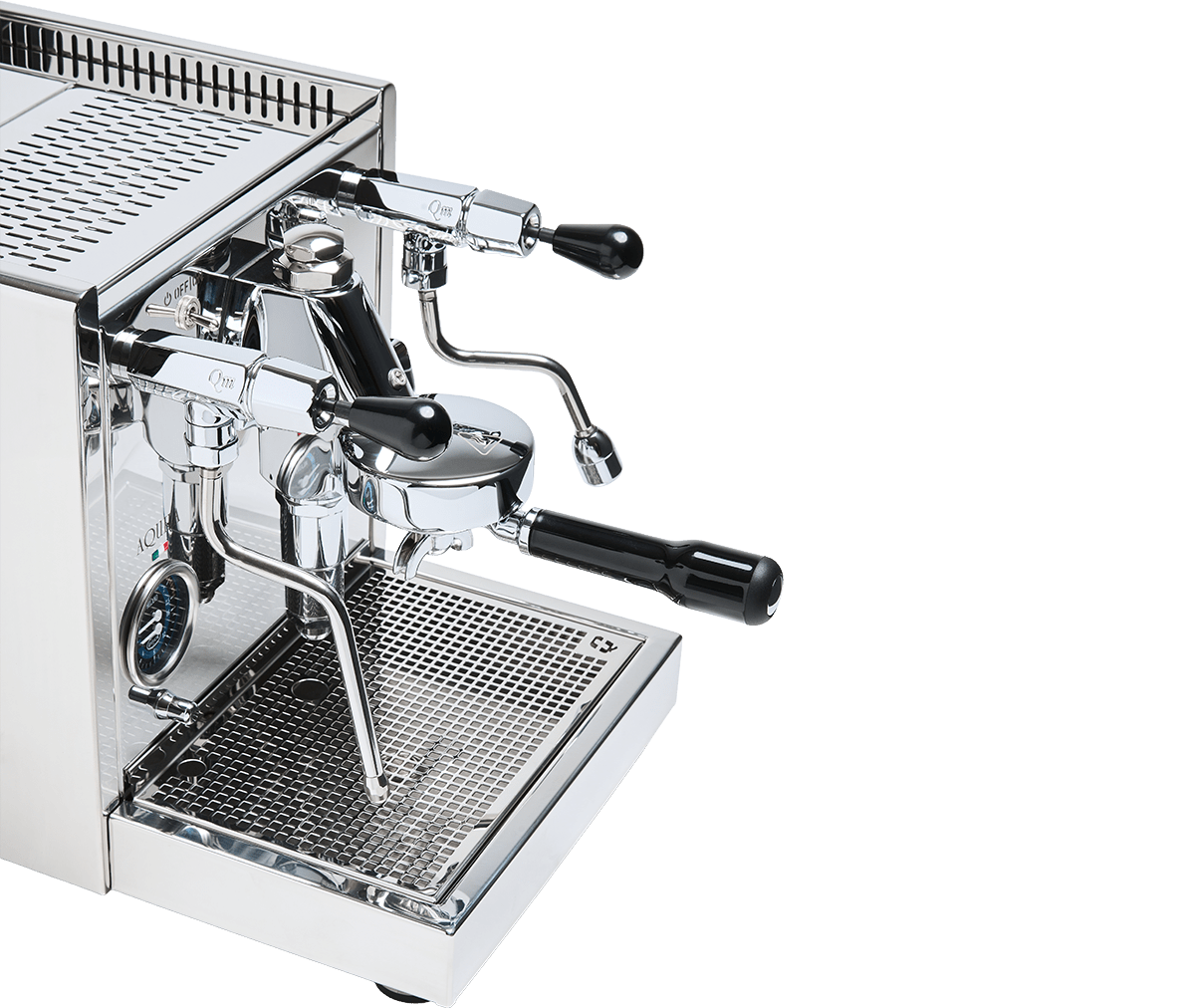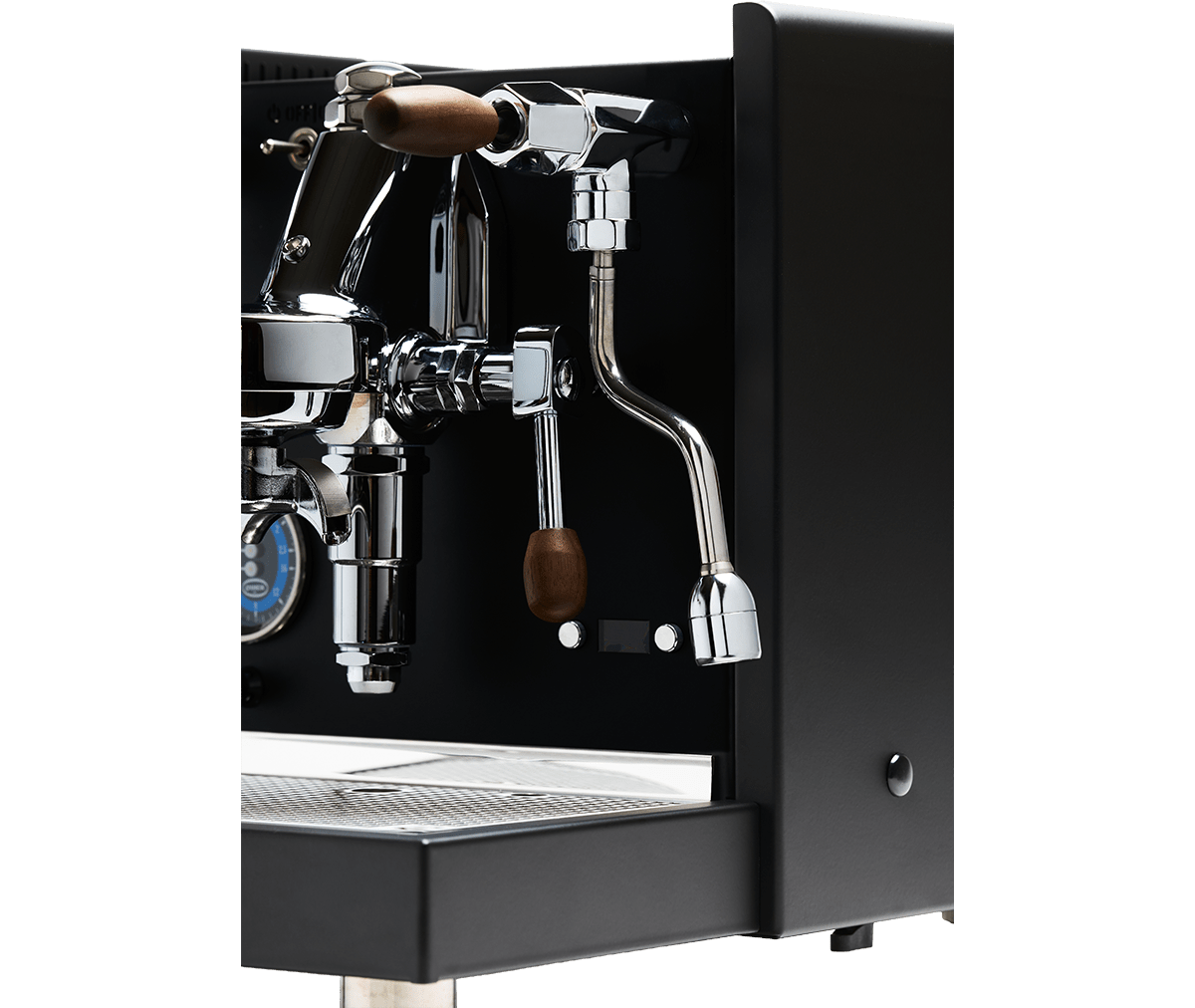 Materiál: Plne nerezová oceľ; dostupné v oceľovej, matnej čiernej a bielej farbe; drevený portafilter a joysticky; Quick Mill filtrovaná káva skupina s nerezovou hubou