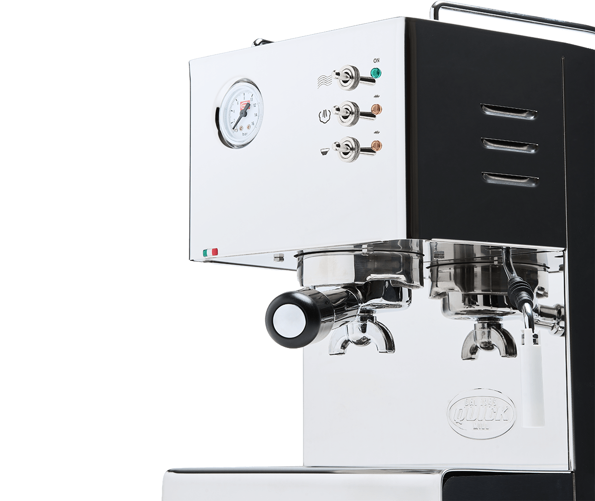 Materiál: Celonerezová oceľ; Quick Mill brygg skupina s O-krúžkom; parná trubica s aerátorom