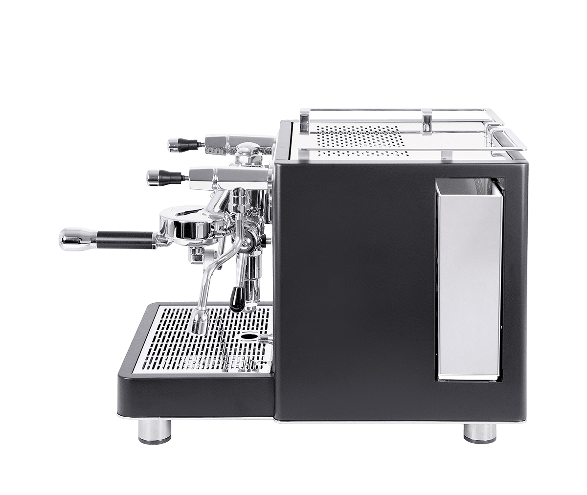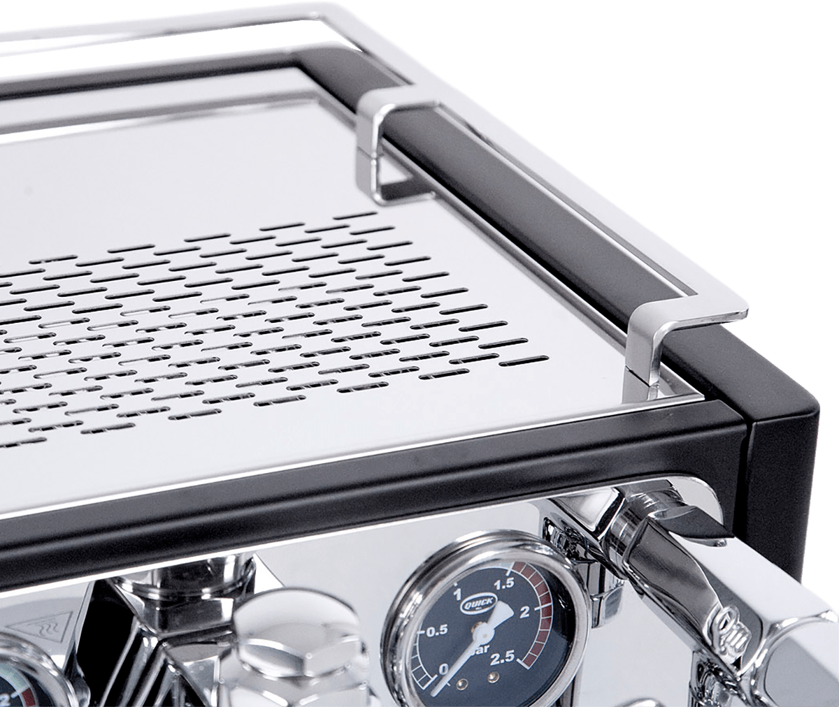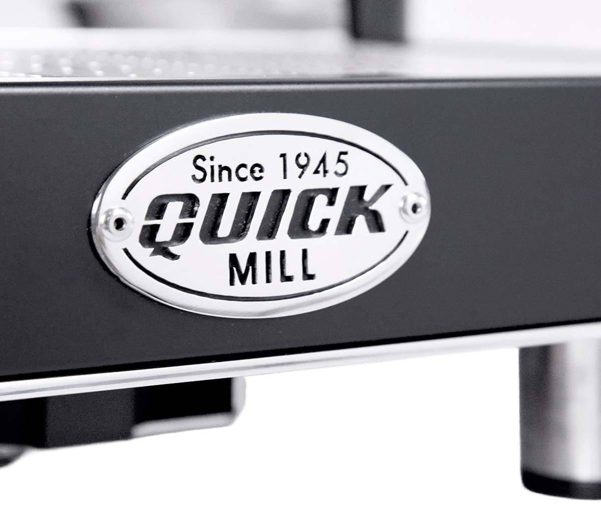 Celonerezová konštrukcia s hlbokými čiernymi detailmi, joystickovými pákami a Quick Mill bryggrupp vytvára profesionálny vizuálny dojem, ktorý sa hodí do kuchyne aj pracovného prostredia.