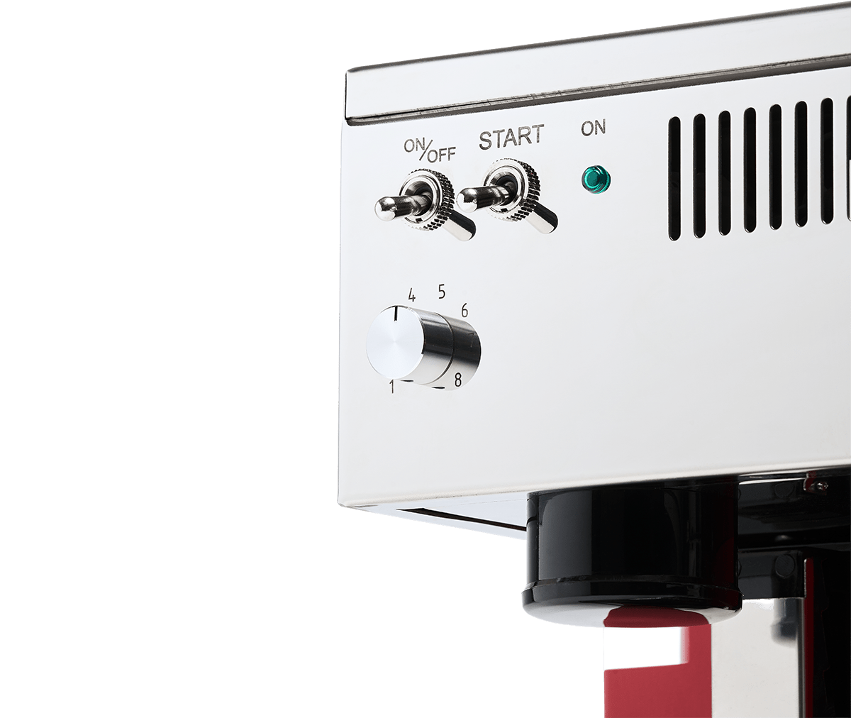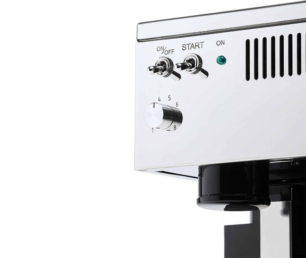 Prístroj sa ovláda klasickými páčkovými ovládačmi, kontrolkami a integrovaným tamperom — kompletný a jednoduchý zážitok “od zrna po šálku”.